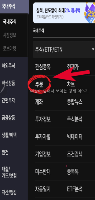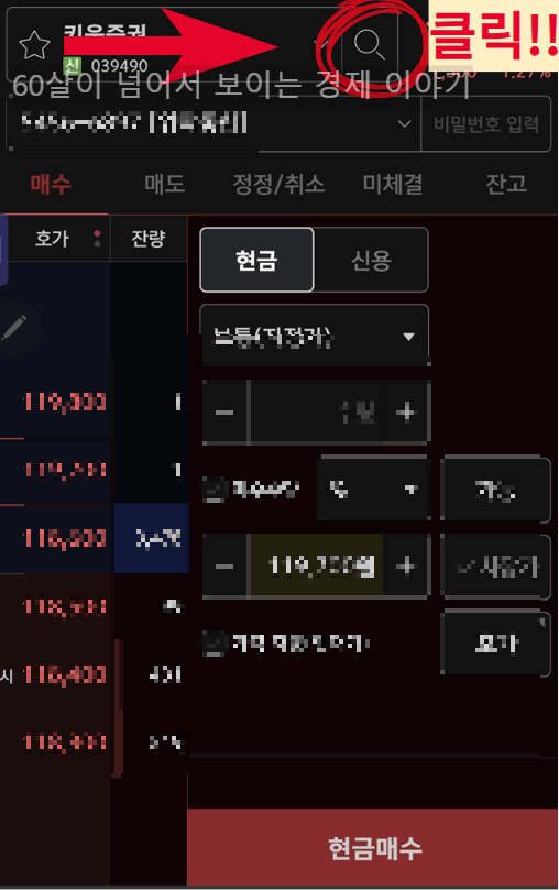 1. 증권사 앱 실행 후 하단의 "메뉴" 버튼을 클릭 해주세요(상단에 종목 검색에 검색하면 안되요)